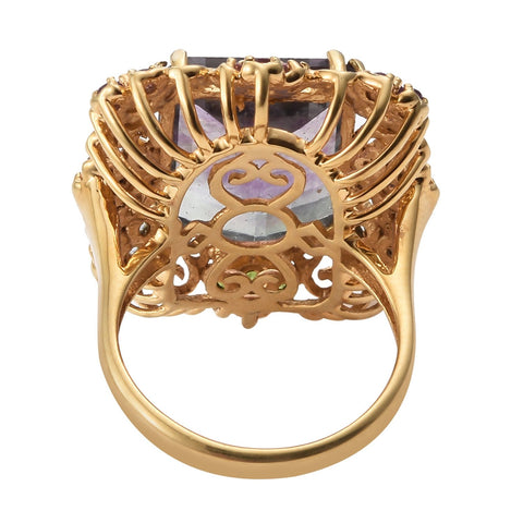 This Yellow Gold Rhodium Ring Is Skillfully Crafted To Perfection, Engraved With Graceful Carvings Displaying Unparalleled Expertise. Transcending Its Beauty Is A Square Multi Fluorite Stone Perched Artfully Atop Amongst Carvings That Display African Amethyst, Russian Diaopside Signity Paraiba Topaz And Tanzanite Gemstones, Intricately Woven Into Enveloping Flowers. This Ring Perfectly Amalgamates Classic And Modern Styles, Lending Itself A Gorgeously Unique Appeal.