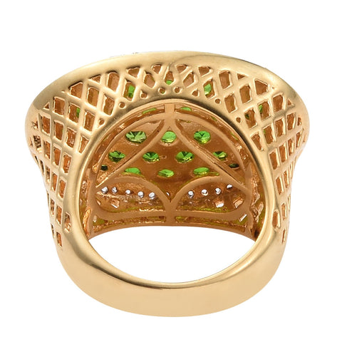 The Stylish Russian Diopside Ring With Sterling Silver Is Polished With Yellow Gold Rhodium. The Multiple Zircon Are Wrapped In A Circle Around The Diopside To Add Its Glitter And Elegance.