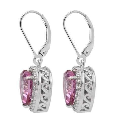Bahaman Heart Shaped Pink Topaz Earrings Set In Sleek Rhodium Outlined By Natural White Zircons