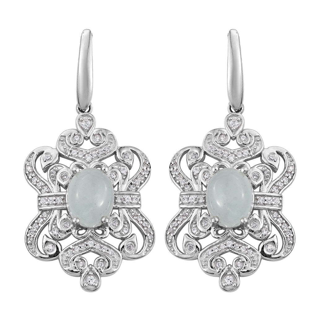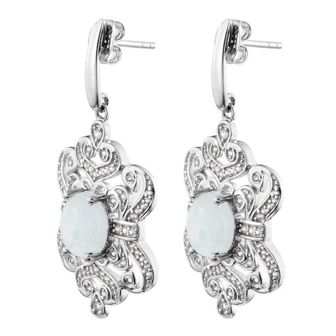 Classy Rhodium Plated Sterling Silver Earring With Polished Milky Aquamarine, Natural White Zircon