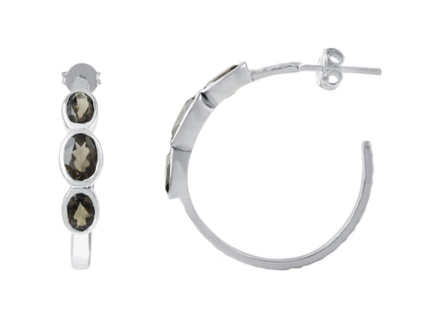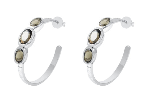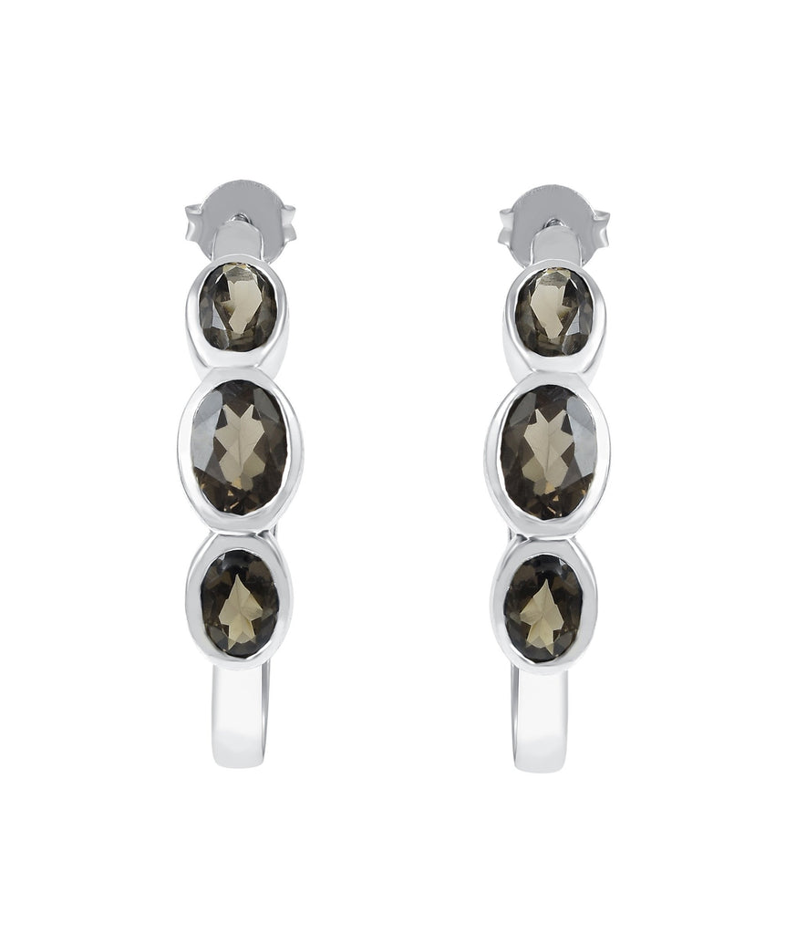 This Elegant Pair Of Earrings Showcases Three Striking Round Enhanced Smoky Quartz Gemstones In A Graduating Design. Skillfully Held In Rhodium, The Gemstones Entrance With Their Smoky Rich Hue. These Appealing Tri- Stone Earrings Are Crafted In Sleek Rhodium.