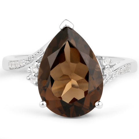 The pear shaped polished Smokey Quartz of this rhodium plated sterling silver ring baffles you with its sheen. The alluring white Topaz enhances its ?lan by manifolds.