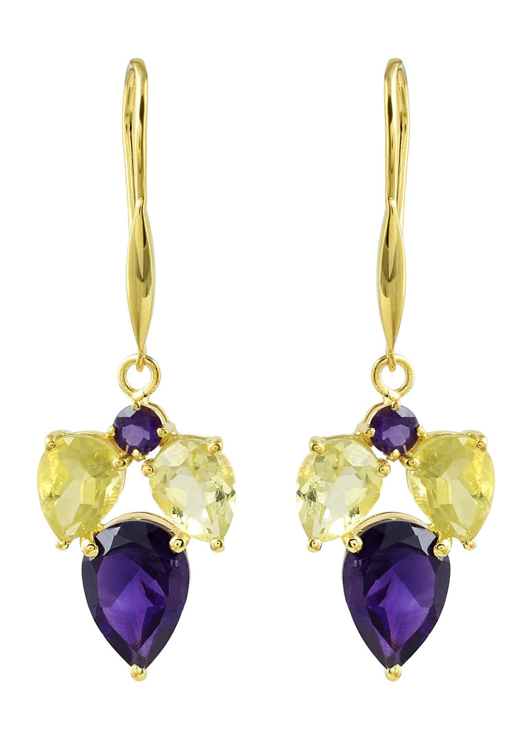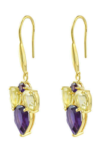 Tri Stoned Amethyst And Lemon Quartz Drop Earrings Set In Yellow Gold